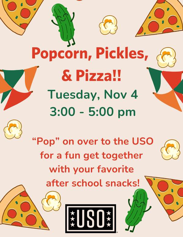 Pop by the USO on Tuesday, November 4th from 3-5pm for your favorite after-school snacks: popcorn, pickles, and pizza! We are staying open later, so come hang out and enjoy some downtime with your military community.