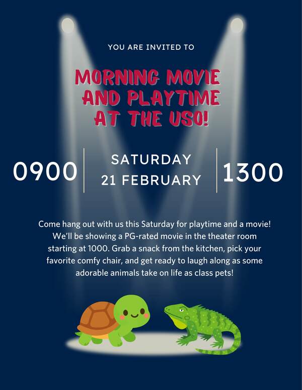 We’ll be showing a PG-rated movie in the theater room starting at 1000. Grab a snack from the kitchen, pick your favorite comfy chair, and get ready to laugh along as some adorable animals take on life as class pets!
